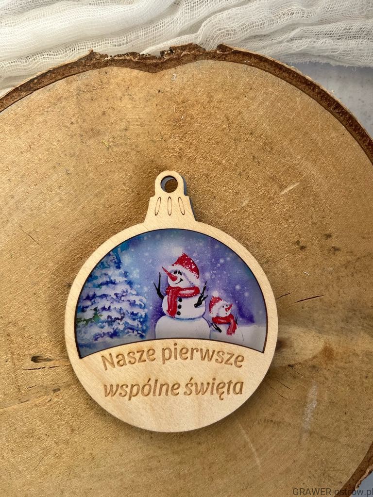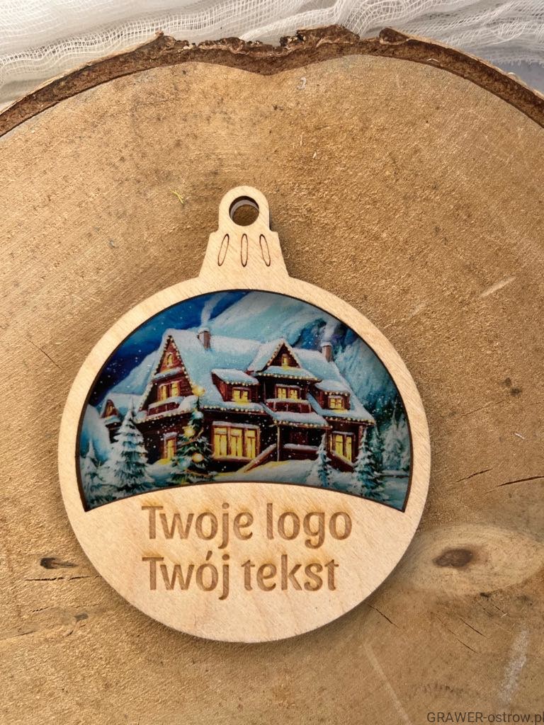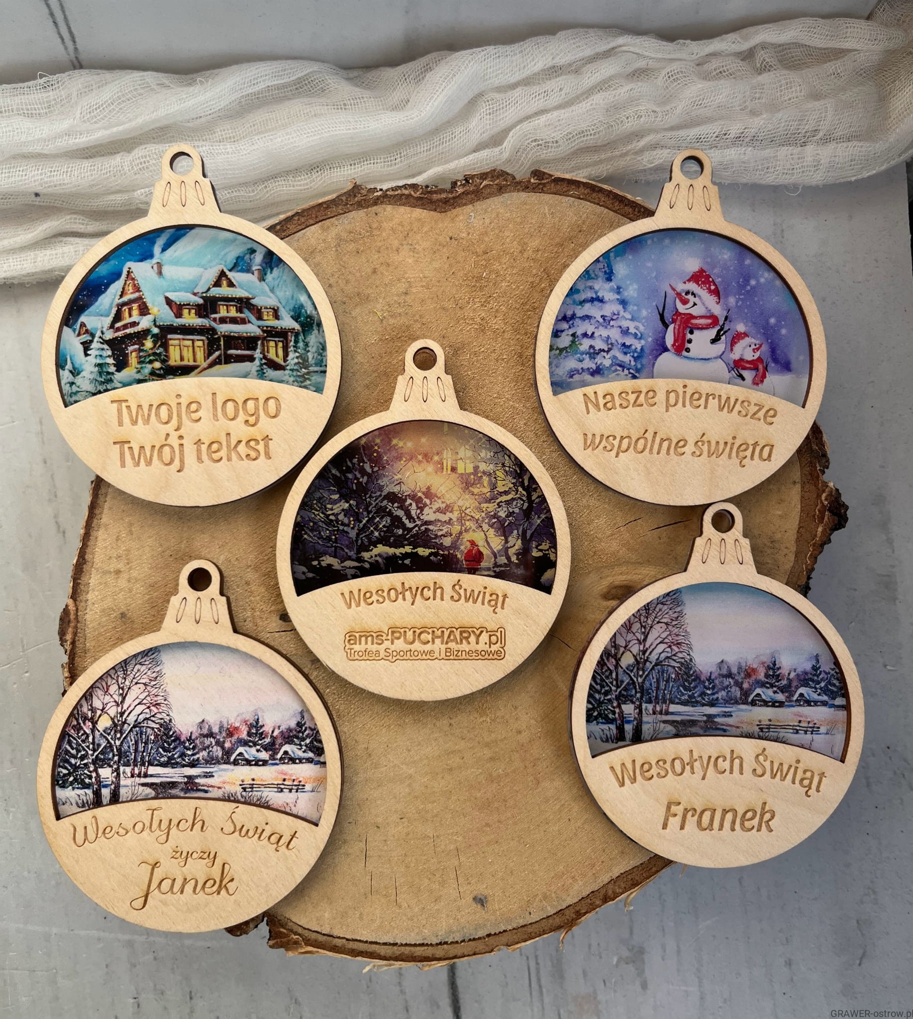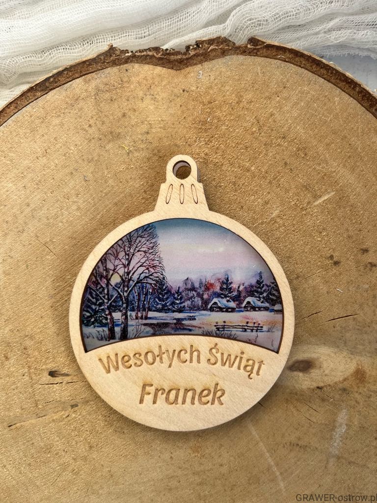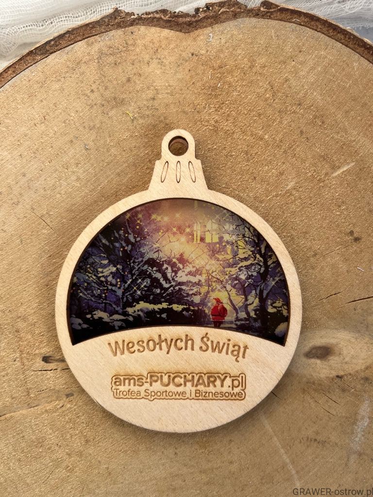 Drewniana bombka dwuwarstwowa z grawerem i kolorowym nadrukiem 9,8cm