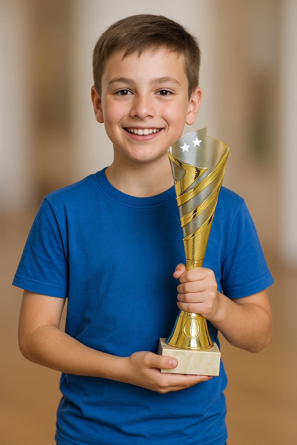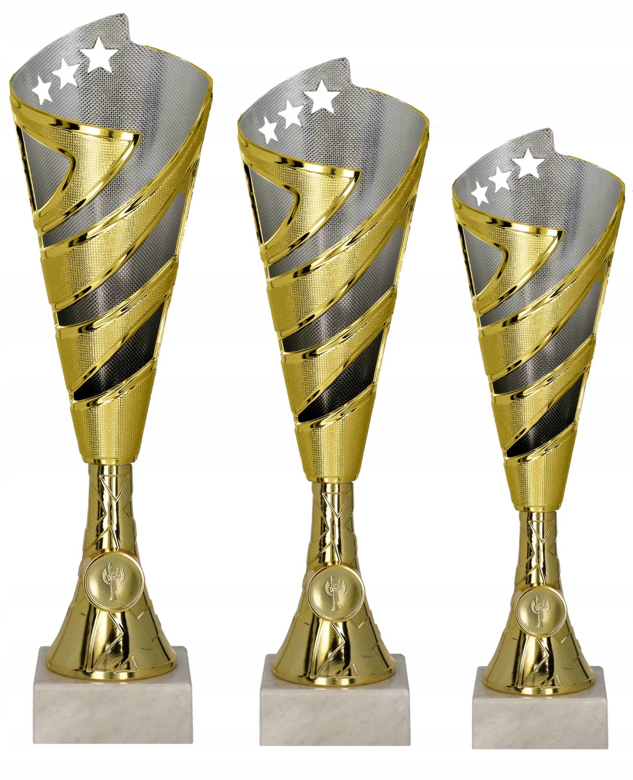 Zestaw trzech eleganckich pucharów w nowoczesnym stylu, wykonanych z tworzywa sztucznego w kolorze złoto-srebrnym. Korpus w kształcie spiralnie skręconego kielicha, z dynamicznym wzorem oraz trzema gwiazdkami wyciętymi w górnej części. Złote elementy są błyszczące, natomiast srebrne mają perforowaną teksturę, która nadaje całości sportowego charakteru. Puchary osadzone są na stabilnych, marmurowych podstawach. Idealne na turnieje sportowe, zawody szkolne, turnieje firmowe i inne uroczystości.