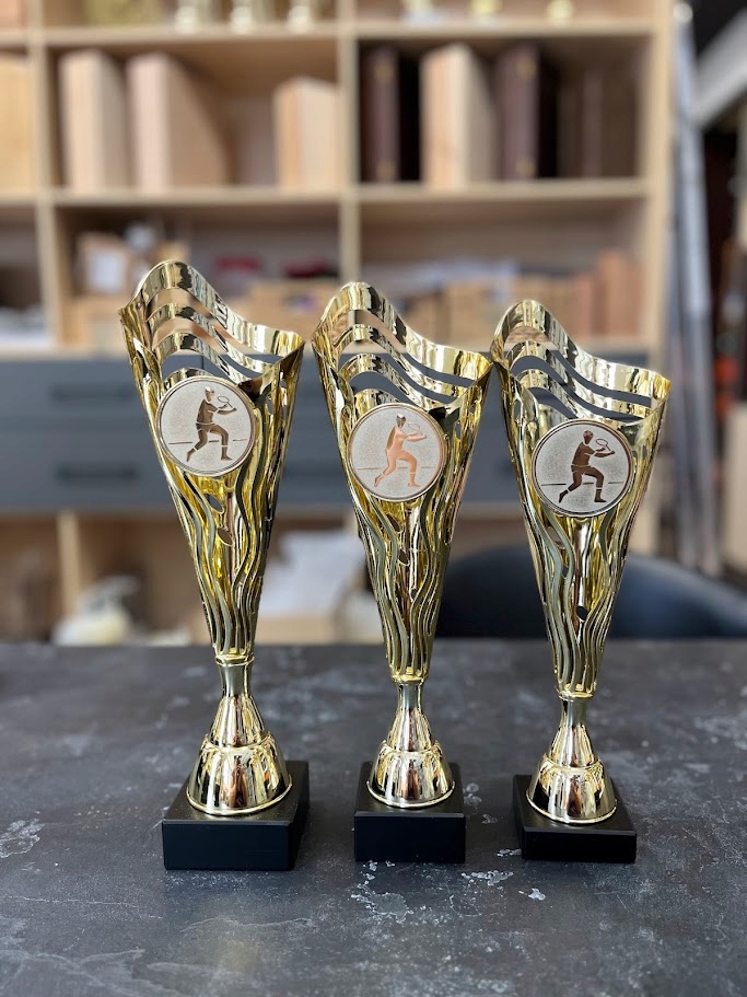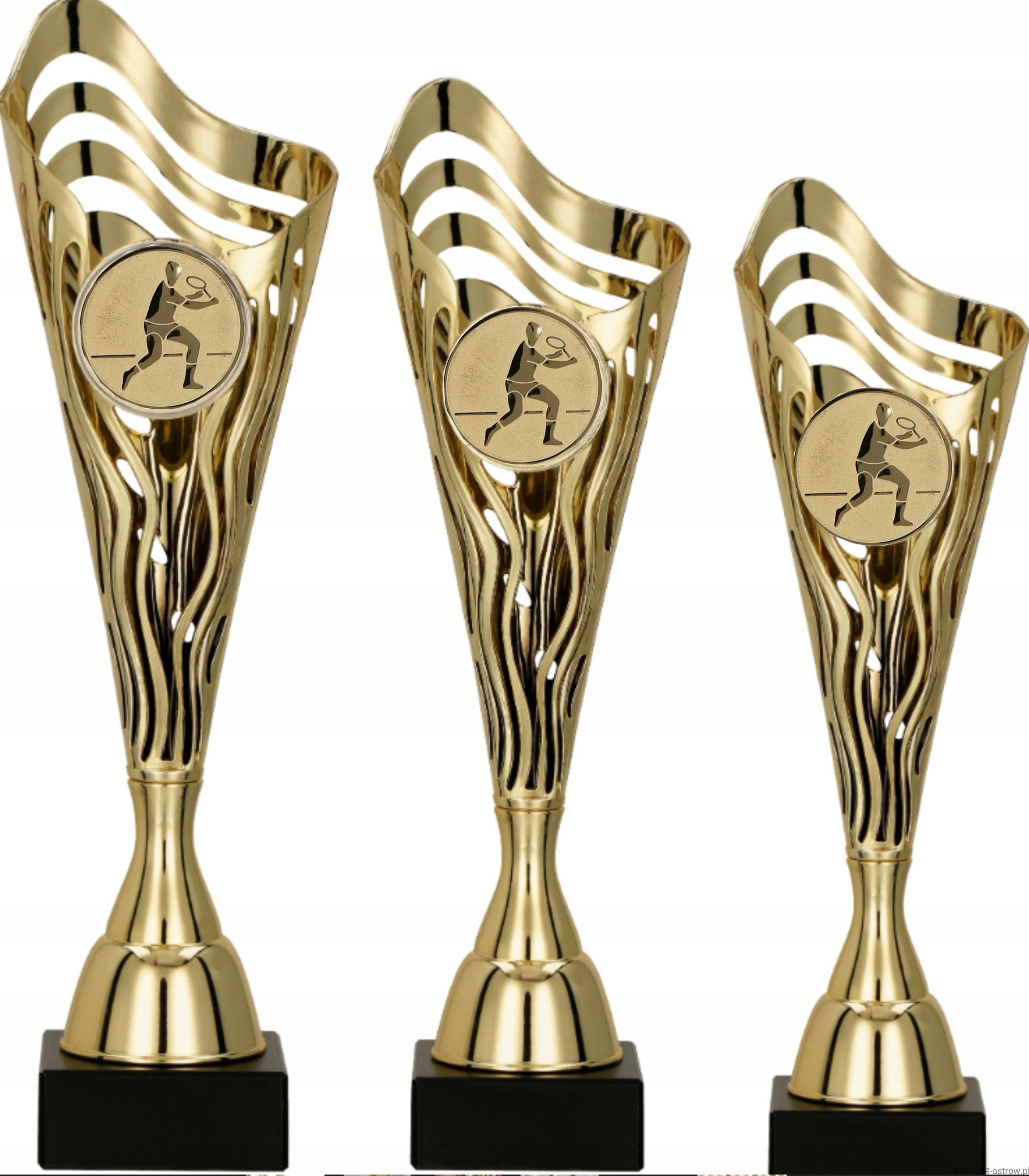 Elegancki komplet 3 złotych pucharów tenisowych z nowoczesnym, ażurowym wzorem i emblematem przedstawiającym zawodnika tenisa ziemnego. Idealne jako nagrody w turniejach tenisowych – zarówno profesjonalnych, jak i amatorskich.