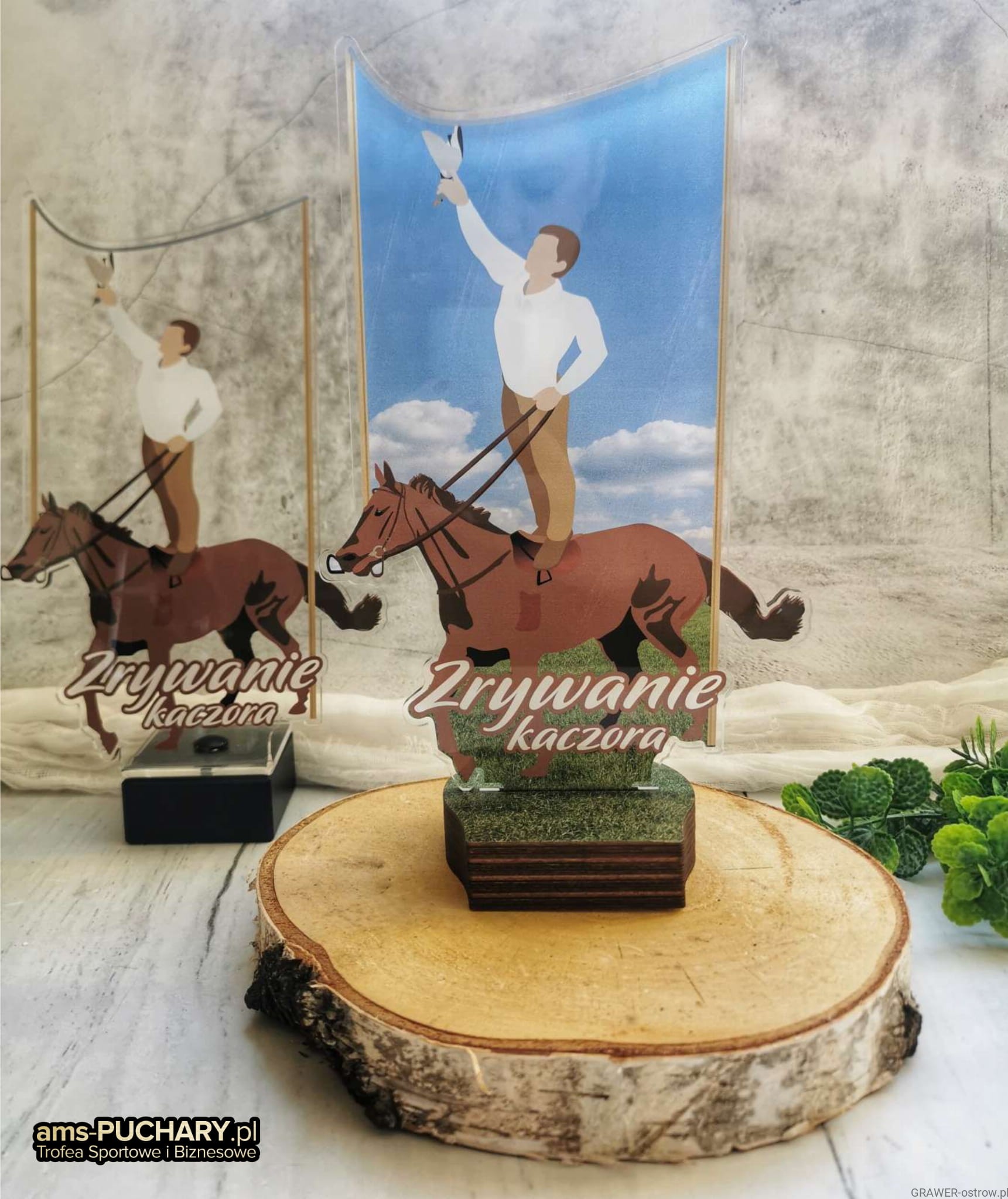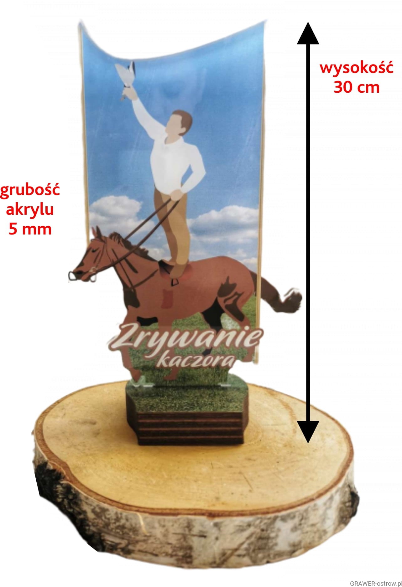 Akrylowa statuetka na postumencie drewnianym, opis gratis